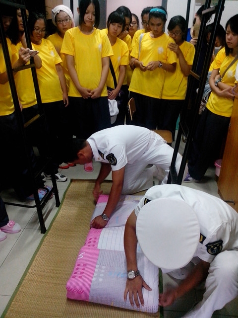 2012年9月13日下午,经过三天军训的考验之后,在第四天教官们来到澳门葡京娱乐 男女生寝室进行整理内务教育,为我们交运专业的学生们讲解了寝室的正规整理要求并亲自进行示范。