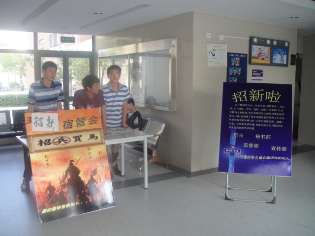 2012年9月24日星期一,经过开学数周的宣传和准备,上海海事大学学生宿舍34&35号楼社区自主管理委员会招新活动于14:00在34号楼一楼办公现场顺利开展。此次活动由34号楼宿舍自主管理委员会楼长袁锋同学带领各部门的部长和层长开展.