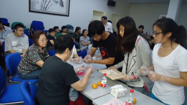 一大早,同学们就带着无比兴奋的心情和服务社会的心态前往枫林社区,借着中秋的契机,为失独老人们送去来自街道、社会和大学生志愿者的祝福——中秋联欢会。本次联欢会由枫林街道计划生育协会主办、飞扬华夏青年公益事业发展中心策划承办。联欢会共分为五个部分,分别是互动认识环节、观看“拥抱”视频、互动游戏、手语歌曲表演和水晶月饼制作。其中,互动游戏“一切听指挥”将联欢会的气氛推向了高潮。游戏中,受邀嘉宾作为指挥官,只能通过简单的方位描述来指挥被蒙住双眼的同学走完全程。尽管嘉宾与同学们接触时间不长,但游戏的完成效果却出奇的好。游戏结束之后,参赛的同学们与嘉宾热烈拥抱,为对方出色的表现感到骄傲。
