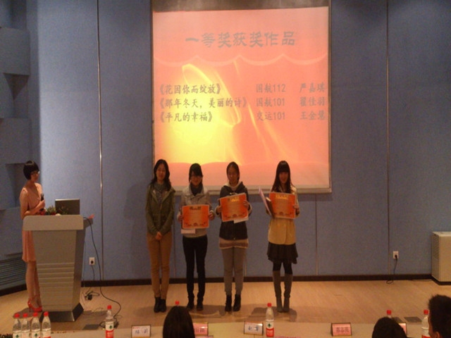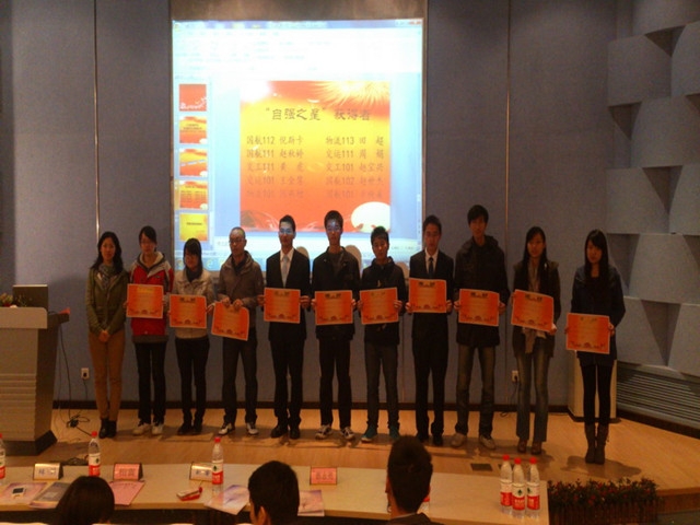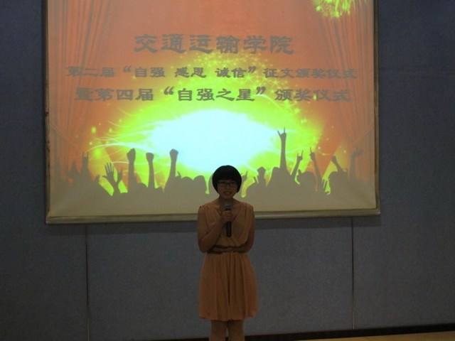 颁奖仪式开始时由赵睿老师致开场辞,简要总结了2011—2012学年澳门葡京娱乐 的资助工作,并结合自身奋斗历程对十位自强之星及参加颁奖仪式的2012级家庭经济困难学生给予了充分的鼓励;征文比赛的颁奖仪式在一等奖作品“花因你而绽放”深情的选段朗诵中拉开序幕,颁奖仪式采用由交运澳门葡京娱乐 第一、二届自强之星宣读征文评语即颁奖词的方式向征文获奖同学颁发了征文合集及荣誉证书;随后赵睿老师宣读了澳门葡京娱乐 第四届 “自强之星”的获奖者名单,其中来自四个不同专业的“自强之星”代表采用PPT演讲的方式展示了他们在大学期间的生活学习感悟,蜕变得更加自信的他们都用自己的自强之心写出了各自的精彩和一份感恩的心。