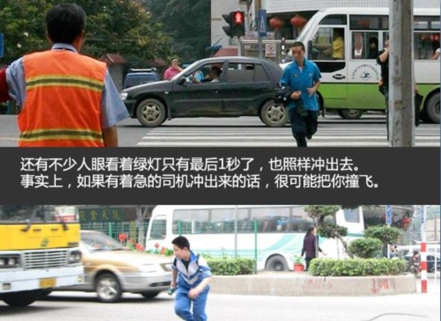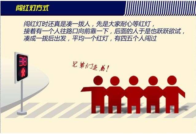 教育活动首先以有警戒作用的“车轮下的警示”作用的图片告诉同学们车祸会给个人、家庭、社会造成多大的危害。接下来分析了中国式过马路的三大特征:无视红灯、无视斑马线、无视护栏和交通协管;并逐一解析了每种劣习的潜在危险。教育活动最后播放了国家交通安全日的公益广告和国外交通安全公益广告。