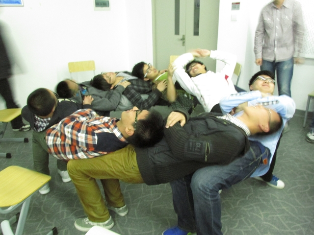主题晚点名进行了十分钟左右的心理游戏--人椅游戏,游戏开始时,所有的同学手搭在前面同学的肩膀上,听从心理委员的指示,坐在身后同学的大腿上,随后所有同学坐在椅子上,一个接一个躺在后面同学的腿上,双脚落地,由工作人员抽去椅子,参与的同学从起初的害怕摔倒,到最后在主持人鼓励下做出勇敢的尝试,最终“人椅”相当成功。