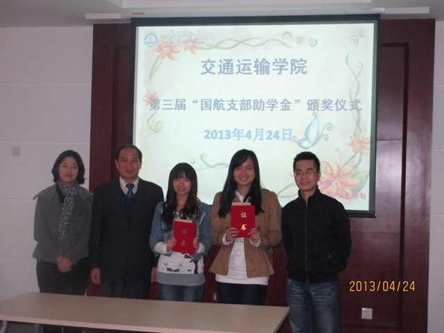 2013年4月24日下午两点,澳门葡京娱乐 第三届“国航教工支部助学金”颁奖仪式在交运澳门葡京娱乐 楼207室举行,仪式由澳门葡京娱乐 辅导员陈祯如老师主持,澳门葡京娱乐 党委副书记赵睿老师、国航教工支部书记赵刚老师、章强老师及两位获奖学生和出席了本次颁奖仪式。