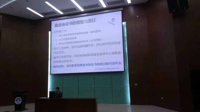 首先,郝老师向2014届毕业生介绍了澳门葡京娱乐 2013届毕业生的就业总体情况,用数据让同学们清楚的认识到就业存在的压力和挑战。接着,郝老师向同学们着重介绍了本科生就业的相关流程和政策,包括就业协议书重要性、报到证的作用和办理、毕业户籍迁移及落户政策、毕业生档案等几个方面的问题。最后,郝老师强调了毕业生在就业求职过程中应该注意的问题,包括简历制作、衣着和言行等方面的问题,希望所有毕业生能找到一个满意的工作。