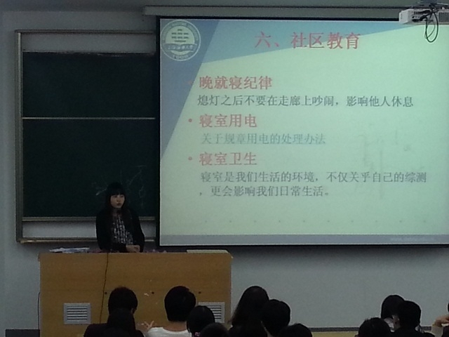 为进一步加强学校的社区教育工作,杜绝安全事故的发生,保障学生高质量的社区生活,促进学校教育教学的正常开展,国航12级全体学生于2013年11月3日晚在3D107开展了社区主题教育活动,国航12级辅导员朱红红老师出席并主持了本次活动。