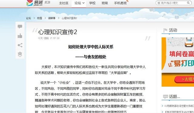 本次宣传活动共分三期。首期的主题围绕“如何与室友的相处”展开,各班心理委员于当晚将宣传内容上传至易班后组织班上的同学进行阅读学习,不少同学反映本次学习内容对大家的人际相处大有裨益。通过此次活动,交运澳门葡京娱乐 在大学生中普及基础心理知识,鼓励同学们相互之间积极沟通,让有压力的同学能够敞开心扉,愿意向老师或者同学诉说烦恼,及时解决问题,在各方压力之下还能保持一颗积极乐观向上的心。