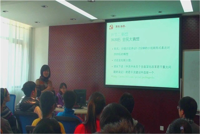 在陈莉老师就《中央关于全面深化改革若干重大问题的决定》原文16项60条进行了简析后,进入生活会的两个互动环节,环节一:是谣言吗(十八大常识竞猜)?并观看视频《三中全会你应该知道的事情》;环节二:2020全民大猜想(十八大三中全会《决定》解析),通过挑选十八大三中全会《决定》的关键词,由同学分组讨论,以短话剧形式畅想对2020年后的生活状态;在上述两个体验式学习基础上,生活会最后在与会党员的热烈讨论和发言中结束。