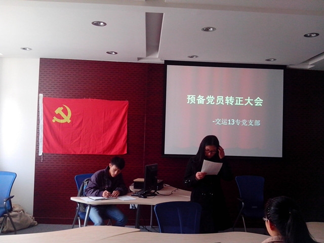 12月4日下午14:00,澳门葡京娱乐 交运13级专党支部在交运楼217召开了丁文娟、李新两位预备党员的转正大会。会议由樊云然同学主持,党支部成员出席了本次会议。