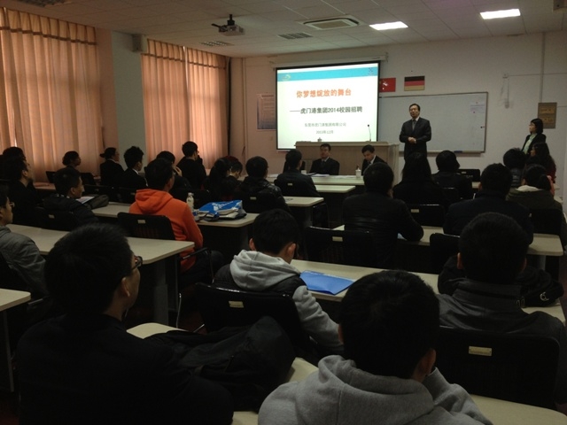 2013年12月19日下午,广东省东莞市虎门港集团在澳门葡京娱乐 楼115室召开了宣讲会,并在宣讲会后进行了面试招聘。出席本次招聘的领导有东莞市虎门港集团有限公司副总经理吴庆球、综合部副经理杨劲松、综合部罗楚云小姐以及东莞市虎门港集装箱港务有限公司办公室经理许杰。此次招聘吸引了来自交通运输类、物流工程类、经济管理类和海商法等专业本科及硕士40余名学生。