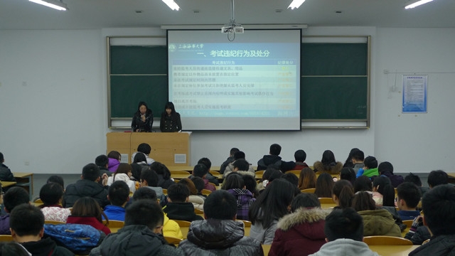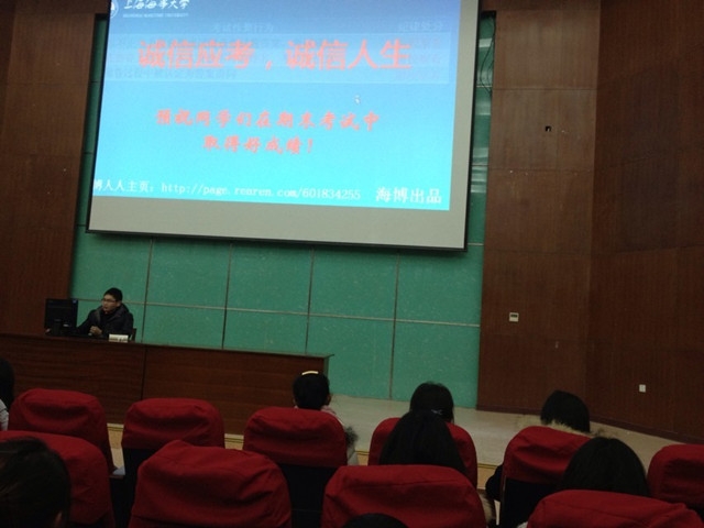 2013年12月22日晚点名时间,澳门葡京娱乐 海博学社在各晚点名教室举行了诚信应考的宣传活动,活动由辅导员宣传PPT进行。