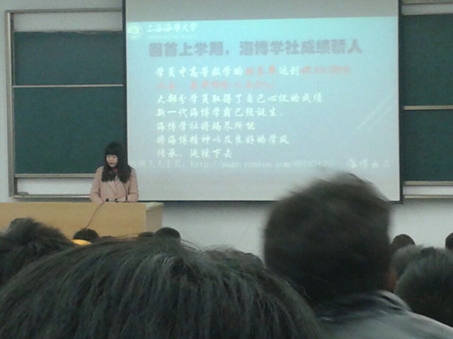 2014年3月2日,在交运澳门葡京娱乐 大一、大二年级的晚点名活动上,海博学社对即将开展的课程进行了宣传。本次活动主要由指导老师朱红红老师组织,海博学社各部门负责协助。