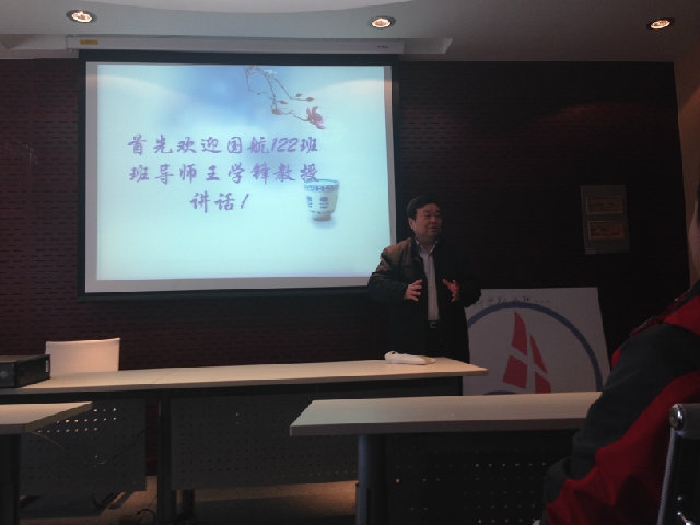首先,王学锋老师开门见山向同学们提出要求:在休息好的前提下紧抓学业,积极参与诸如“挑战杯”、科创的学术活动,积极撰写论文,强调了创新的重要性,此外,经验丰富的王老师提出了“玩与学结合”的理念,以亲身经历和未来计划刷新了同学们对航运业的看法。接着,朱红红辅导员对国航122班上学期的努力表示了赞扬,并提出了新的要求,希望能办出更多的活动,保持并减少班级的挂科率,争取成为年级甚至全校的领头羊。最后,班长姜天依介绍了这学期新转来的同学,并用ppt的形式带领全班同学回顾了上学期的各项活动,以签名留言的方式让全班同学在巨大的班徽KT版上写下了新学期的计划,以便在期末检测是否实现。