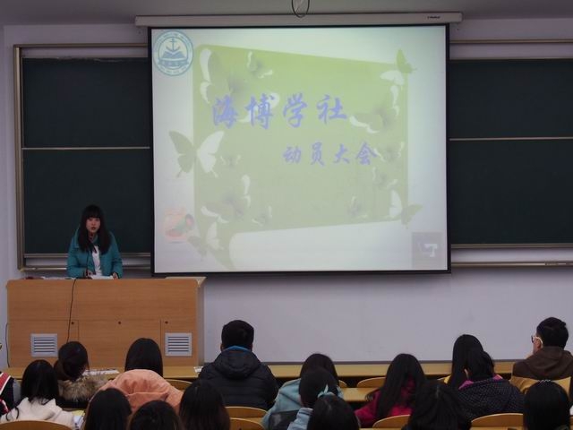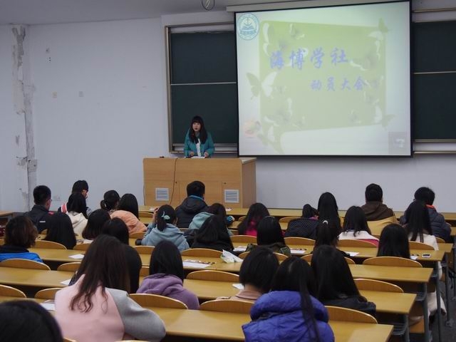 2014年3月16日晚,澳门葡京娱乐 海博学社在教学区3D107教室举行海博学社全体社员大会。海博学社指导老师朱红红及全体海博成员参加此次大会。