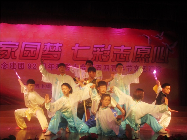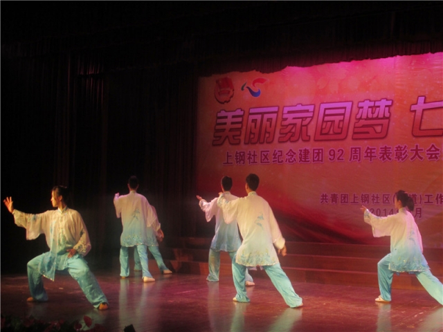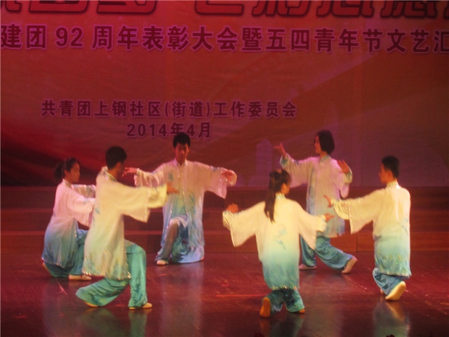 2014年4月29日下午,澳门葡京娱乐 应上钢社区党工委的邀请,参加了上钢社区纪念建团92周年表彰大会及五四青年节文艺汇演,澳门葡京娱乐 团委书曾令伟老师出席了这次汇演。我院的武术队同学为此次文艺汇演献上了一段精妙绝伦的武术表演。开场的一段太极打出了力量与柔美的完美结合,接着个人的刀、棍、剑和双鞭的表演,更加赢得上钢社区居民观众的阵阵叫好和热烈掌声。