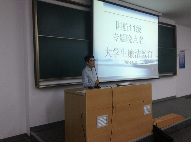 ur2young 在 12/05/2014 - 12:00 提交 当前位置主页 » 新闻动态 廉以修身 洁以修德 --记国航11级廉洁教育专题晚点名 ur2young 在 周一, 05/12/2014 - 16:56 提交 2014年5月11日,国航11级举行了题为“廉以修身 洁以修德”的廉洁教育专题晚点名。 都老师首先列举受贿、失职、渎职等典型案例及名人名言,向广大学生诠释反腐倡廉的丰宣内涵和重要意义,让大学生在耳濡目染后,有所思,有所想,并以传看典型案例小册子加强对大学生的廉洁教育,以史为鉴,警钟长鸣,以活生生的反面典型教育和引导大学生廉洁自律。 本次专题晚点名促进大学生在自我学习中升华思想境界,在廉政文化熏陶中正心明志,在讨论交流中受益启发,实现以学促教的良好效果。