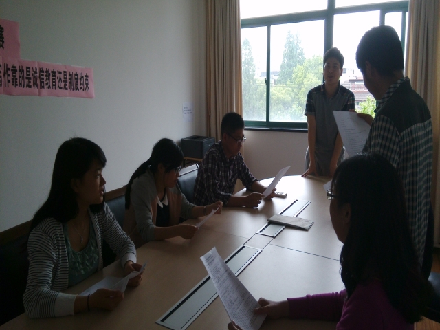 为了提升我院研究生的学术诚信意识,同时进一步开拓研究生的学术视野,2014年5月26日下午,澳门葡京娱乐 2013级研究生于澳门葡京娱乐 会议室开展了一场“论文写作靠的是诚信教育还是制度约束”为主题的辩论赛。这次活动邀请到了校辩论赛冠军队的王汉、李薇作为本次活动的评委。