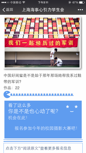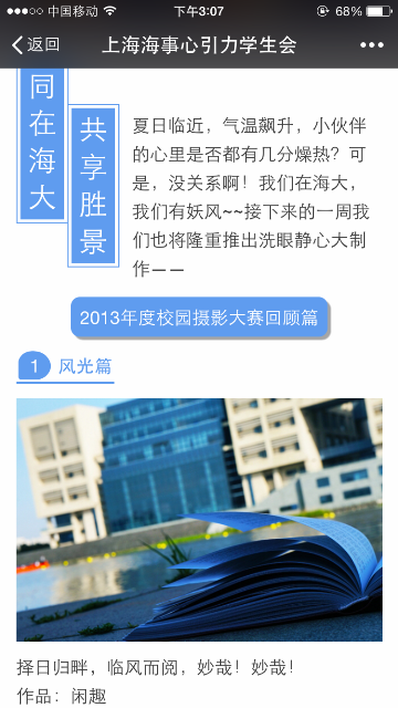 在活动的推广上,心引力学生会不仅制作海报在北广张贴宣传,同时也利用晚点名在不同的澳门葡京娱乐 进行了宣传介绍。近期,在心引力微信公众号上也开展了以“朝花夕拾,写意海大”为主题的往届优秀获奖作品的宣传,充分响应“四进四信”之“进网络”的号召,运用网络平台,结合时代发展趋势,吸引更多学生参与进来。