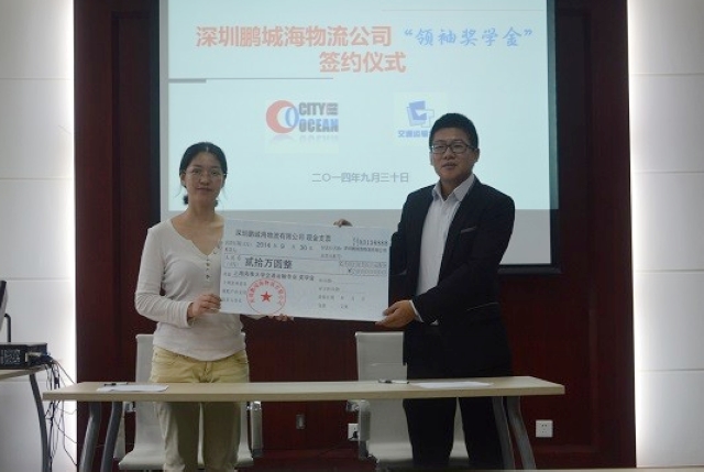 2014年9月30日上午10:30,深圳鹏城海物流有限公司在我校澳门葡京娱乐 交通运输专业设立的“领袖奖学金”签约仪式在交运楼207举行。院党委书记冯晨曦老师、党委副书记赵睿老师、学生资助中心主任相雷老师、深圳鹏城海物流有限公司华东区总经理郁凯宇先生、市场部经理虞恩华先生以及交运专业学生代表参加了签约仪式。签约仪式由澳门葡京娱乐 团委书记曾令伟老师主持。