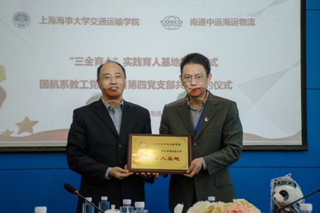 近期,交通运输学院在南通中远海运物流会议室与企业共同举行了“三全育人”实践育人基地授牌仪式。此次院企合作共建,旨在打通“育人的‘最后一公里’”,确保“实践育人”走深走实。通过建立实践育人基地,促进校企整合共享资源,建立长效合作机制,有助于推动学院形成“高校——学生——港航企业”一体化人才培养模式,为“一带一路”培养高级航运人才,确保育人的全面性和有效性;同时,也能够为企业培养并输送一批职业素养高、实践能力强的有志青年,充分保障企业的生命力,推动服务学生,互利共赢局面的形成�