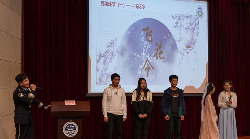 讲座中,陈曦骏以“海”字为主题的飞花令调动起现场气氛,五位同学轮番上场,展开了一场激烈的诗词对决。陈曦骏还从学校专业特色出发,与师生分享了若干首与海相关的诗词。