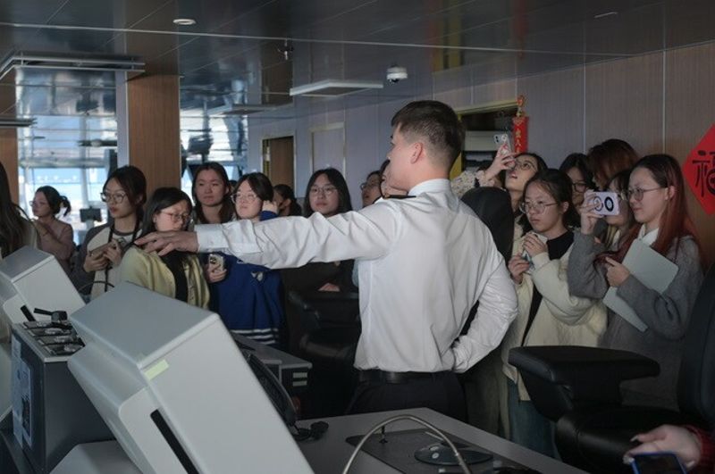 实地探秘,深化专业认知。同学们在老师们的带领下深入船舶核心区域,分批参观了驾驶室和轮机舱。在驾驶室内,先进的船舶导航系统、精密的通讯设备以及船长和船员们严谨有序的工作状态,让同学们近距离感受到船舶航行操控的专业性与复杂性。讲解员详细介绍了驾驶台值班制度、船舶航行计划制定、避让规则执行等内容,与同学们在课堂上学到的航海知识相互印证,进一步加深了对船舶航行管理的理解。踏入轮机舱,巨大的动力装置、复杂的管道线路以及轰鸣的机器声,展现出船舶动力系统的强大魅力。同学们了解到轮机部的职责分工,从主机的日常维护、辅机的运行管理,到船舶电力供应系统的保障,每一个环节都关乎船舶的安全稳定运行。通过实地参观,同学们对船舶动力原理、设备操作及轮机管理有了直观认知,为交通运输专业中涉及船舶动力与运行保障的知识板块提供了实践支撑。